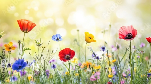 Joyful Bloom: Bright Flower Meadow Awash in Sunlight and Bokeh - Vibrant Nature Scene for Summer Greetings and Celebrations