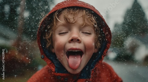 Joyful Child Playing in the Rain Wearing Red Raincoat with Happy Expression