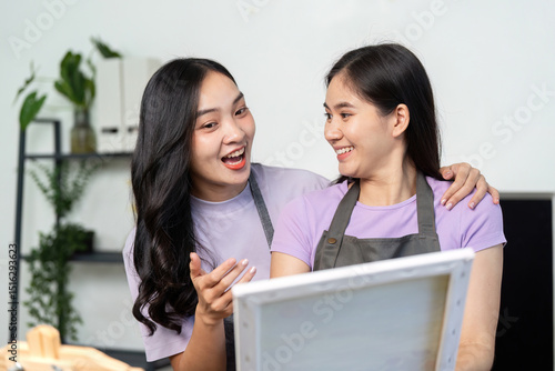 Joyful Friendship. Two women sharing laughter while painting in a bright space.