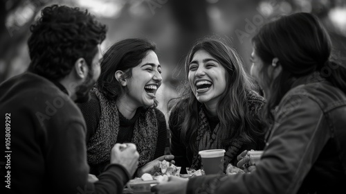 friends, laughing, gathering, outdoors, happiness, joyful, fun, bonding, snack, smile, amusement, camaraderie, cheerful, relaxed, group, festive, eating, socialising, laughter, youth, vibrant, chinese, culture, sweet, enjoy, leisure, playful, casual attire, black-and-white, interaction, shared, togetherness, happy, conversation, wholesome, food, picnic, friendship