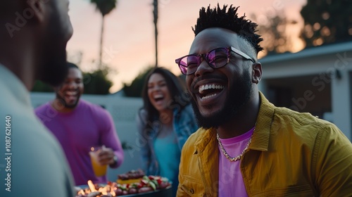 friends, bar-b-q, laughter, sunset, fun, enjoyment, smile, party, cooking, food, summer, gathering, grilling, happiness, drink, music, vibrant, colours, camaraderie, celebration, togetherness, clinking, conversation, casual attire, warmth, atmosphere, joy, socialising, fashion, shades, hat, community, lively, relaxation, cheerful, diversity, playful, sharing, delicious, appetiser, moment, aroma, dessert, memory, bonding, vibe