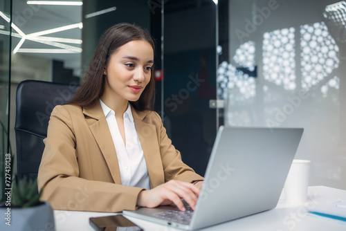 Joyful girl smiling look at laptop at office, working remotely, discussing a new project online