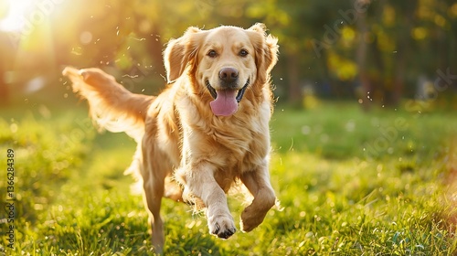 Joyful Golden Retriever bounding across a sunlit meadow ears flapping and tongue hanging out as it chases after a frisbee thrown by its owner embodying pure canine happiness