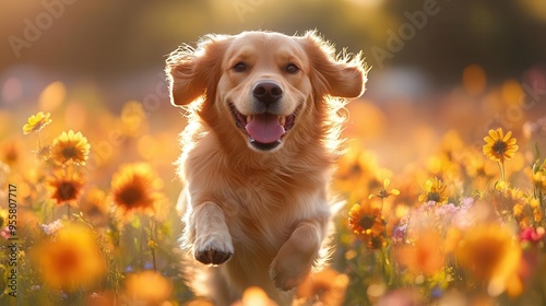 joyful golden retriever midleap in sunlit meadow tongue lolling and ears flapping vibrant wildflowers in foreground