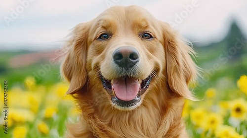 gold, retriever, dog, smile, happy, joyful, pet, animal, mammal, canino, portrait, face, closeup, nature, flower, yellow, wildflower, field, meadow, outdoors, spring, summer, warm, sunshine, light, friends, companion, loyalty, affection, trust, cute, adorable, domestic, breed, portraiture, fluffy, smiling, fauna, wildlife