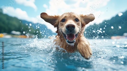 dog, gold, retriever, swimming, water, happy, playful, nature, animal, summer, fun, action, splash, movement, pet, fur, canino, joyful, excitement, leisure, recreation, lake, river, sunlight, droplet, energy, scenery, wildlife, beautiful, happiness, swim, adventure, expression, freshness, wet, carefree, blue, joy, friendship, companionship, health, fitness, vibrant, landscape