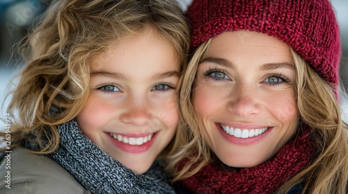 joy, happiness, holiday, winter, snow, family, mother, daughter, blond, curly, red, foulard, hat, smile, laughter, affection, hugs, togetherness, cold weather, seasonal, festive, warm, cosy, portrait, lifestyle, human relationships, young, adult, casual attire, friendly, cheerful, candid, natural, genuine, heartwarming, heartfelt, sweet, tender, precious, memory, bonding, connection, love, holiday spirit