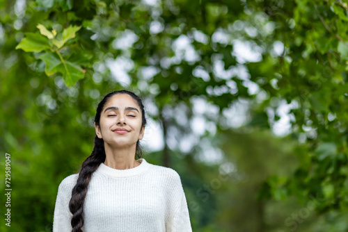 Joyful indian woman enjoying a leisurely stroll in the city park