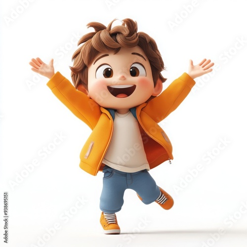 Joyful Jump: A 3D cartoon boy radiates pure happiness with a wide, infectious grin, his arms outstretched in a jump of excitement. Perfect for illustrating childhood joy and carefree fun.