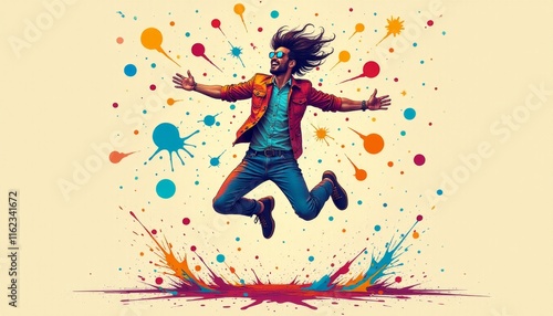 leap, joy, colours, celebration, outdoors, sunny, man, energy, vibrant, paint, dynamic, creativity, festival, happiness, art, expression, movement, sky, fun, style, casual attire, excitement, summer, bright, playful, motion, youth, cheerful, atmosphere, freedom, splash, liveliness, wear, urban, spirited, colourful, background, energetic, display, day, adventure