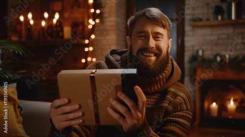 joyful man with beard holds gift box, smiling warmly in cozy, festive setting. background features soft lights and decorated fireplace, enhancing holiday spirit