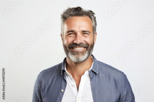 adult, beard, copy space, face, facial hair, front view, grey, grey hair, happiness, happy, head shot, human hair, indoor, mature, man, one person, people, person, portrait, smile, smiling, studio, white background, casual clothes, cheerful, content, contented, delighted, elated, exuberant, glad, joyful, overjoyed