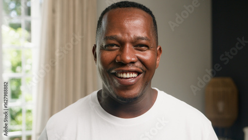 black, portrait, happy, cheerful, happiness, home interior, natural light, bright, positive, joyful, lifestyle, content, relaxed, indoor, indoor, closeup, casual attire, friendly, warm, genuine, authentic, white shirt, living room, casual clothes, expressive, approachable, smile, smiling, grinning, laughing, sunny day, personality, calm, calmness, relaxing, relaxation, well-being, charme, peaceful