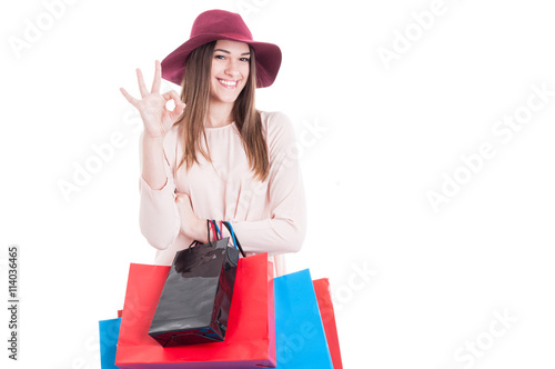 Joyful pretty female showing ok sign and carrying shopping bags