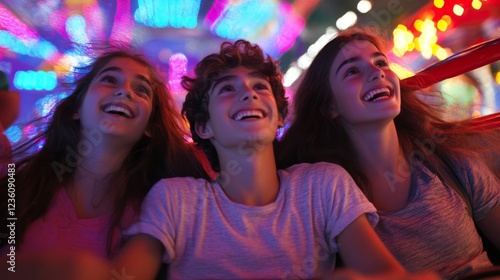 teenage, friends, amusement, park, funfair, night, light, colourful, happy, joyful, laughing, smiling, excited, entertainment, festival, carnival, celebration, youth, adolescence, togetherness, friendship, summer, vacation, holiday, nightlife, bright, vibrant, spectacular, amazing, marvellously, magical, whimsical, dreamy, positive, optimistic, upbeat, energetic, dynamic, active, playful, carefree, irresponsible, leisure, recreation, people, portrait, group
