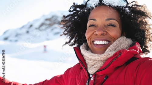 woman, winter, snow, mountain, happy, smile, selfie, portrait, cold, red, jacket, ski, snowboarding, fun, nature, landscape, frigid, frosty, icy, chill, glee, cheerful, merry, joyful, smiling, content, elated, radiant, exuberant, picturesque, scenic, serene, beautiful, amazing, gorgeous, wonderland, adventure, travel, sport, season, outdoors, person, people, foulard, fur, clothing, fashion, happiness