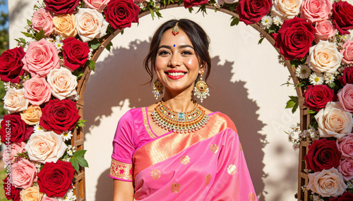 woman, joy, saree, celebration, floral, vibrant, sunny, ceremonial, pink, archway, culture, beauty, happiness, traditional, jewellery, smile, ethnic, festive, decoration, summer, portrait, nature, rose, flower, feminine, joyfulness, elegance, light, colours, accessory, emotion, coiffure, make-up, 1, person, bright, ornate, cheerful, warmth, relaxation, aesthetic, day, closeup, event