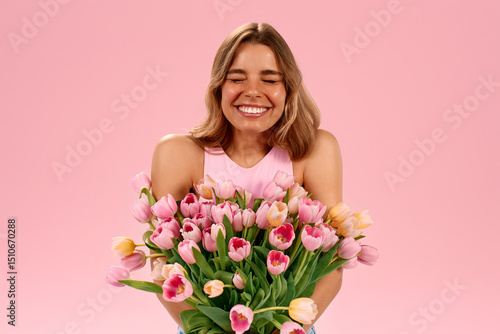 woman, tulip, pink flower, bouquet, laughing, smiling, closed eyes, happiness, joy, cheerful, spring, floral, fresh, cute, feminine, bloom, blossom, celebration, fun, vibrant, young, positive, pastel, trendy, stylish, beauty, romantic, closeup, bright, light, pretty, natural, uplifting, sweet, charming, emotional, radiant, gorgeous, elegant, modern, graceful, glowing, love, attractive, lifestyle, indoor