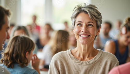 smiling, woman, happiness, gathering, community, joy, connection, people, adult, emotion, interaction, warmth, camaraderie, positivity, celebration, engagement, event, social, atmosphere, togetherness, relationship, lively, friendly, age, casual attire, sweater, light, soft, ambience, indoor, decor, natural light, smile, diverse, socialising, 1, audience, laughter, kindness, inclusion, moment, energy, adult, group, face, expressiveness