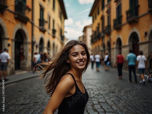 woman, smiling, city street, urban, happy, lifestyle, travel, cheerful, missy, portrait, natural light, candid, fashionable, brunette, long hair, european city, summer, joy, beautiful, female, happiness, stylish, carefree, modern, casual attire, tour tourism, city landscape, trendy, architecture, fashion, people, city landscape, attractive, wanderlust, relaxed, fun, confident, exploring, traveler, europa, positive, vibrant, model, adventure, digital artwork