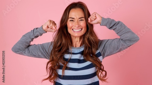 celebration, woman, portrait, fun, fashion, excitement, smiling, happiness, beauty, model, success, joyful, energy, confidence, casual attire, health, adult, studio, standing, vibrant, female, cheerful, lifestyle, positive, long hair, enthusiasm, expressive, teeth, charme, femininity, playfulness, youthful, glee, genuine