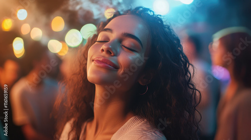 joyful woman with curly hair enjoys vibrant party atmosphere, surrounded by colorful lights and blurred figures. Her serene expression captures essence of celebration and happiness