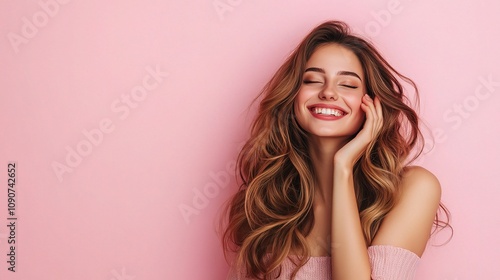 woman, smiling, face, beauty, hair, portrait, happiness, confidence, glow, skin, gentle, touch, pink, expression, joy, cheerful, attractive, youthful, charming, carefree, emotion, fashion, style, modern, aesthetic, warm, natural, serene, bright, facial, wellness, lifestyle, relaxed, health, radiant, blissful, make-up, minimalistic, closeup, feminine, elegance, grace, soft, chic