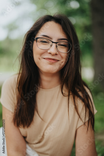 Joyful woman with glasses enjoying a sunny day outdoors in the park. Her warm smile and casual style convey feelings of happiness, relaxation, and connection amid a serene natural backdrop.