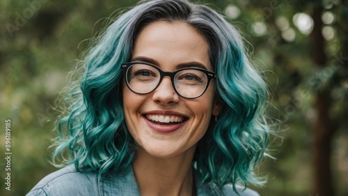 Joyful woman with teal hair and glasses enjoying the outdoors