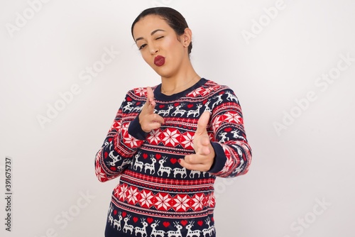 Joyful Young beautiful Arab woman wearing Christmas sweater, against white background wink and points index fingers at camera, chooses someone, makes finger gun pistol.