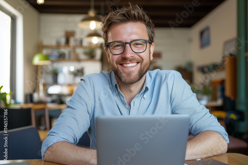 Joyful young businessman with trimmed beard in cozy workspace, wearing casual light blue shirt and stylish glasses, smiles warmly and friendly celebrating a successful project or happy moment