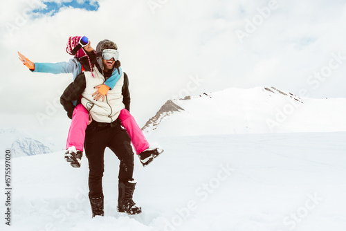 couple, skier, fun, piggyback, holiday, vacation, mountain, ski resort, man, woman, skier, snowboarder, happiness, freedom, blue, sky, bright, georgia, ski, snow, winter, love, friends, tour tourism, adventure, leisure, joy, sport, carefree, holiday maker, escaping, lifestyle, europa, alps, alpine, positive, model, holiday maker, promo, banner