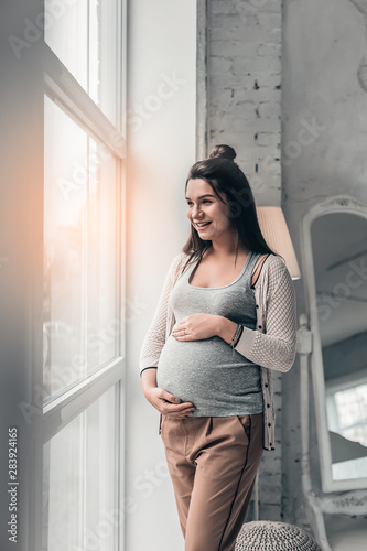 Joyful young pregnancy standing near big window