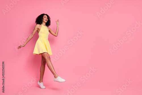 going, step, young, girl, female, woman, girlfriend, student, glamour, style, fashion, model, girlish, yellow, dress, stylish, trendy, summer, spring, black, hair, skin, african, american, multinational, beautiful, attractive, charming, cute, happy, funny, leisure, advertising, shopping, promoting, holiday, pink, diversity, luxurious, chic, fancy, beauty, date, celebrate, birthday, event, elegance, copy space, mini