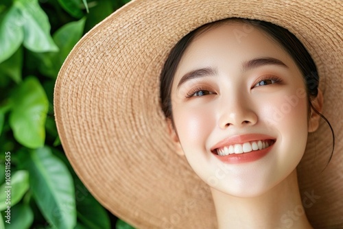 Joyful young woman smiling outdoors natural setting portrait photography vibrant greenery upbeat mood for lifestyle inspiration