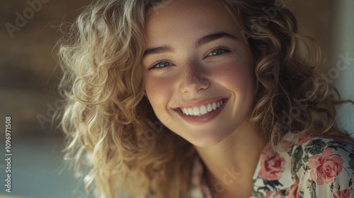 woman, smile, curly hair, happiness, daylight, beauty, joy, portrait, young adult, casual attire, relaxed, floral pattern, expression, sunlight, carefree, youthful, friendliness, cheerful, engaging, light, closeup, warmth, candid, nature, personal, emotion, authenticity, enjoyment, serenity, style, dynamic, charme, glow, lifestyle, pleasant, confidence, radiant, high-coloured, delightful, inviting, connection, appreciation, bliss, attractiveness