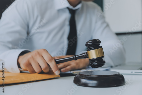 Judge gavel with Justice lawyers having team meeting at law firm in background. Concepts of law.