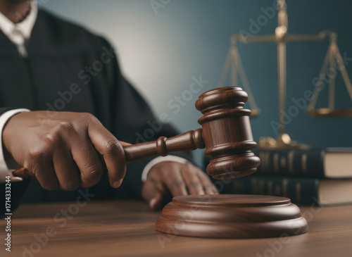 Judge striking wooden gavel in courtroom with legal scales and books in the background symbolizing justice and law
