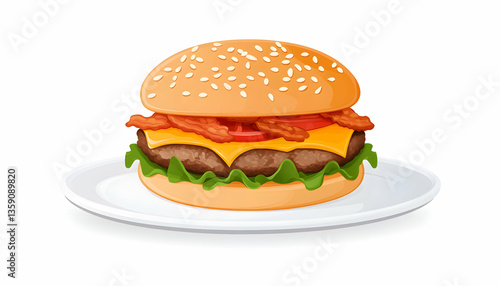 burger, cheeseburger, bacon, hamburger, fast food, food, meal, lunch, dinner, patty, cheese, lettuce, tomatoes, bun, sesame, seed, plate, white, background, isolated, delicious, tasty, deliciously, appetising, craving, junk food, unhealthy, greasy, rich, meat, beef, grilled, cooked, eatery, cafes, dinner, kitchen, cooking, ingredient, preparation, serving, side, dish, snack, picnic, party