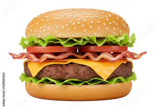 Juicy bacon cheeseburger with lettuce, tomato, crispy bacon, and sesame seed bun, isolated on white background