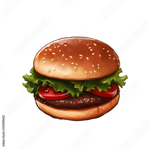 Juicy Beef Burger Illustration Delicious Sesame Bun, Cheese, Tomato, Onion