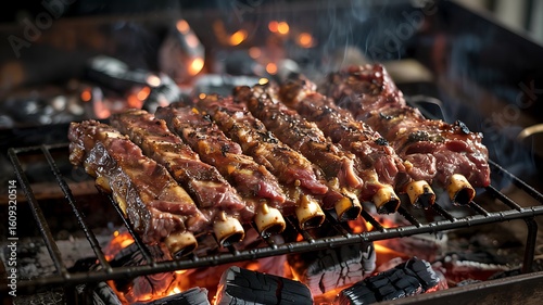 Juicy beef ribs sizzling on a hot grill over glowing embers and flames creating a delicious smoky flavor and aroma