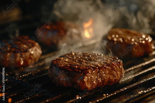Juicy burger patties sizzling on a hot grill with flames and smoke creating a mouthwatering barbecue scene