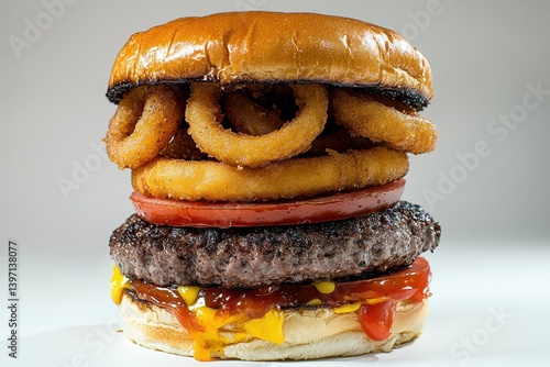 Juicy burger with fried onion rings, beef patty, tomato, and sauces. Perfect for food blogs, menus, or restaurant advertising materials.