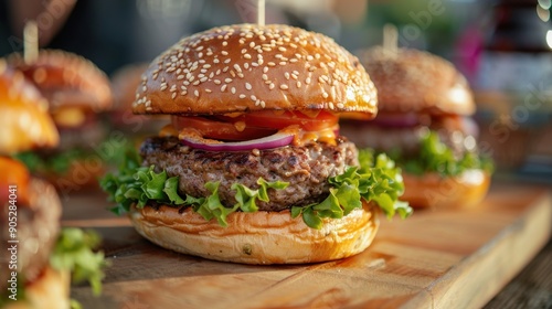 Juicy Burgers in the Setting Sun: A close-up of mouthwatering burgers, their sesame seed buns glistening in the golden hour light.