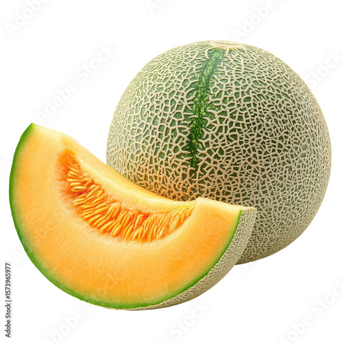 Juicy Cantaloupe Melon Slice and Whole Fruit Isolated on Black Background isolated on a transparent background