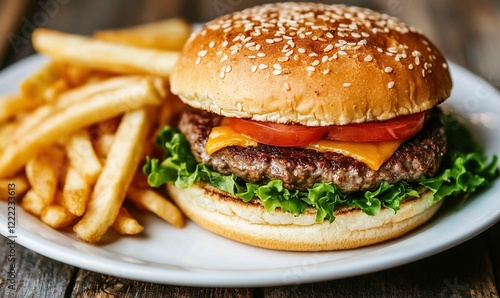 cheeseburger, fries, burger, plate, wood, table, rustic, juicy, cheese, lettuce, tomatoes, beef, meal, lunch, dinner, fast food, eatery, food, delicious, tasty, ravenous, snack, american, classic, bun, sesame, fresh, cooked, patty, greasy, unhealthy, eat, sandwich, menu, order, cookery, fat, protein, calorie, meat, fast, casual attire, epicure, background, wooden, white, dish, serving