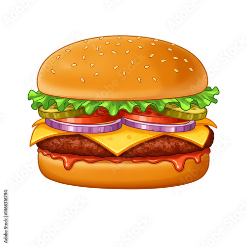 cheeseburger, burger, hamburger, food, food photography, fast food, junk food, delicious, tasty, appetising, eatery, menu, website, illustration, cartoon, clip art, graphic, drawing, digital artwork, high-quality, hd, image, photo, picture, visual, media, marketing, advertising, promotional, cookery, beef, cheese, lettuce, tomatoes, onion, pickle, bun, patty, ketchup, mustard, sauce, eating, meal, dinner, lunch, snack, epicure