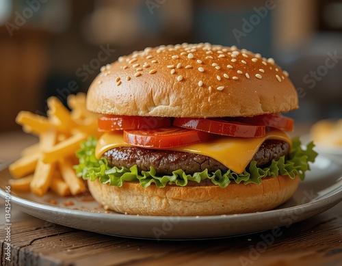 Juicy cheeseburger with cheddar, lettuce and tomatoes close-up