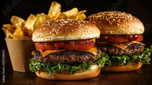 cheeseburger, hamburger, fries, potato chips, juicy, crispy, delicious, tasty, food, meal, dinner, lunch, fast food, comfort food, burger, tomatoes, lettuce, cheese, seared, greasy, grease, side dish, snack, potato, chips, junk food, fats, rich, savoury, flavorful, mouth-watering, appetising, indulgent, satisfying, hearty, filling, wholesome